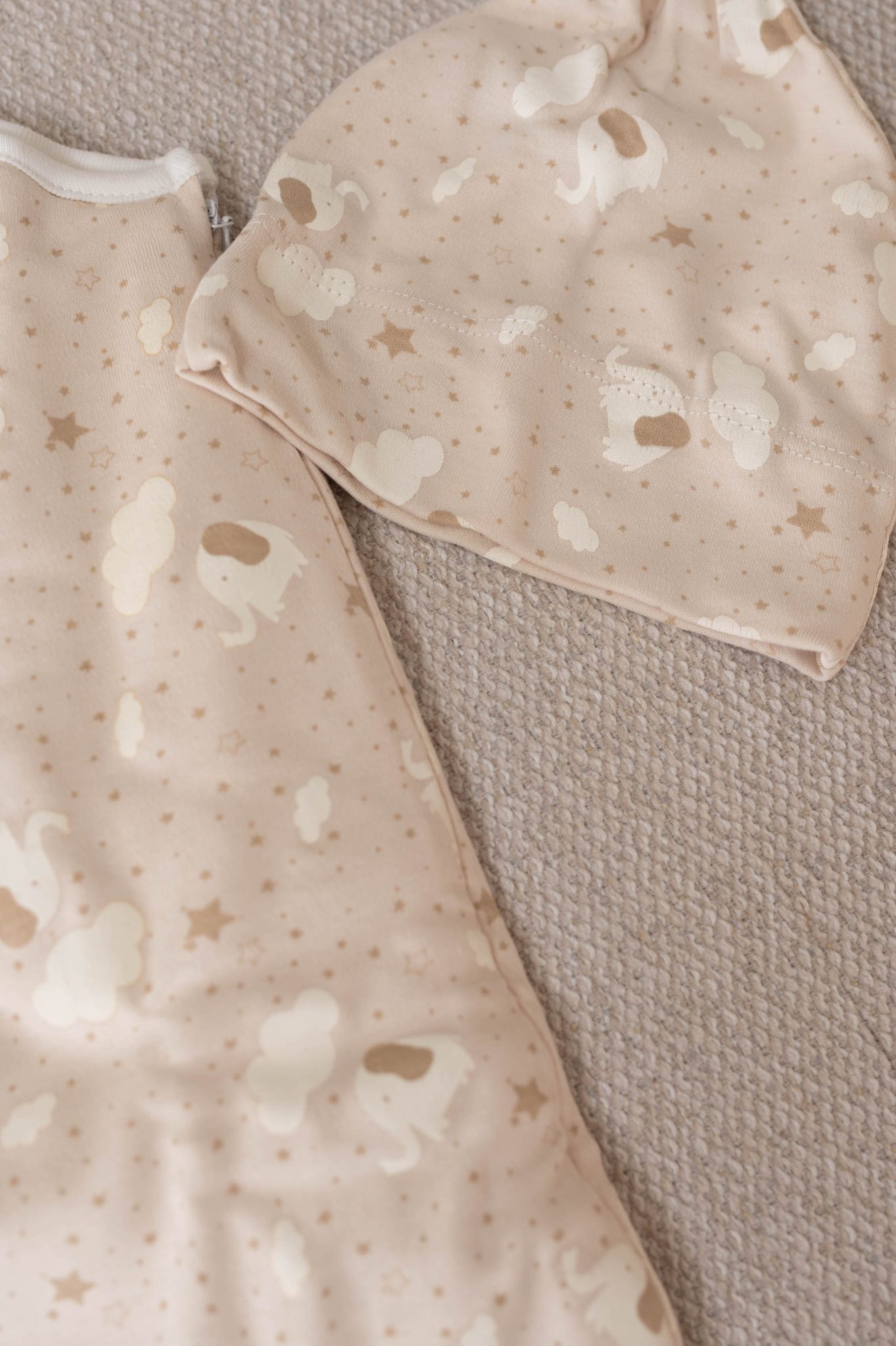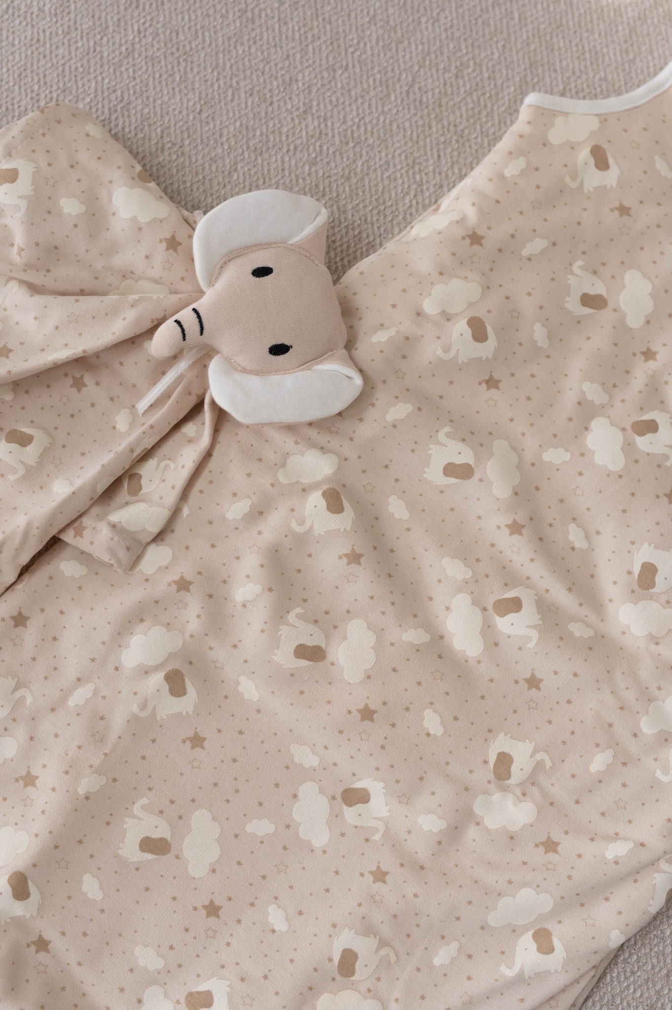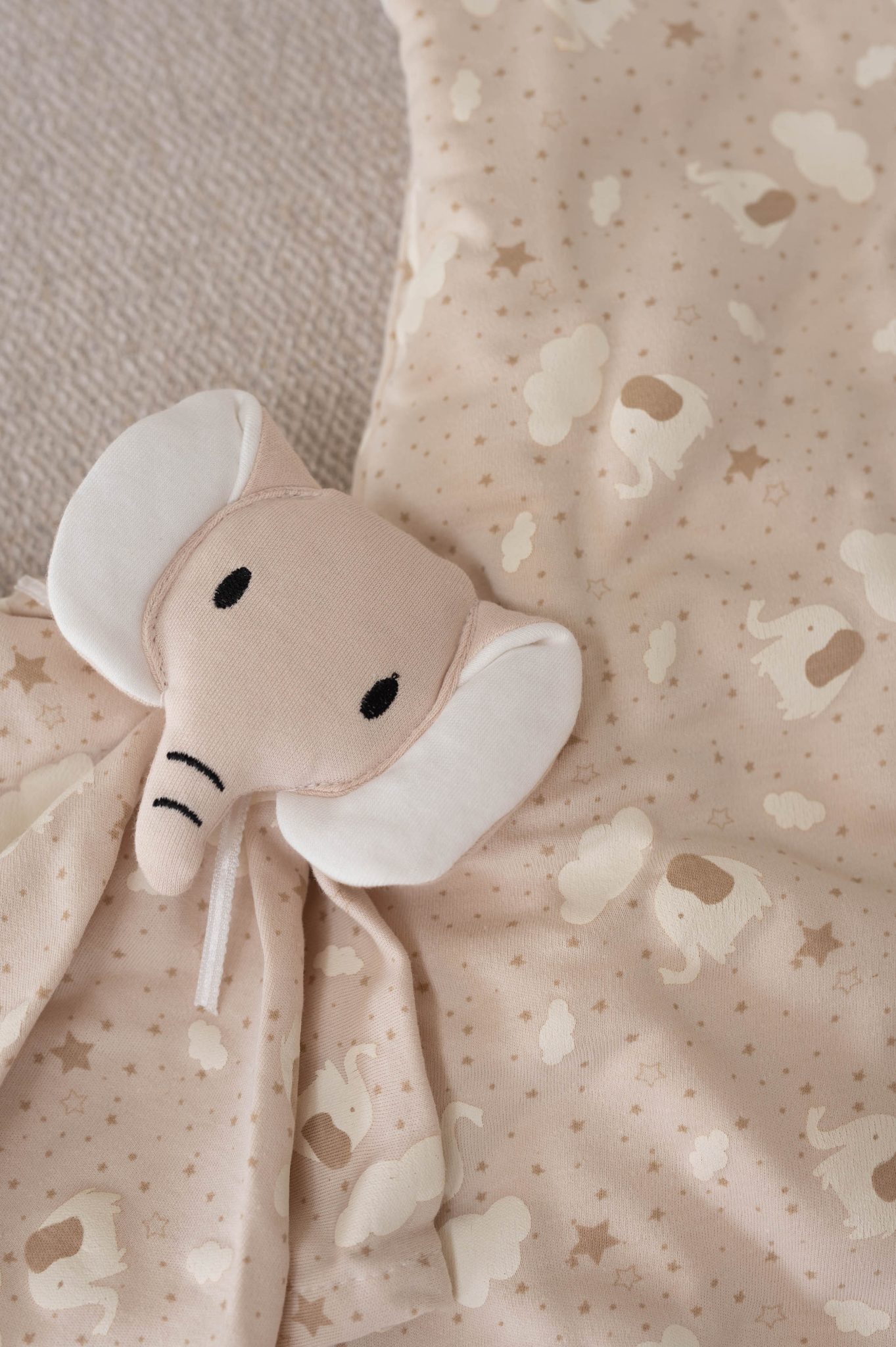 – Couleur taupe et imprimé éléphant, étoiles et nuages