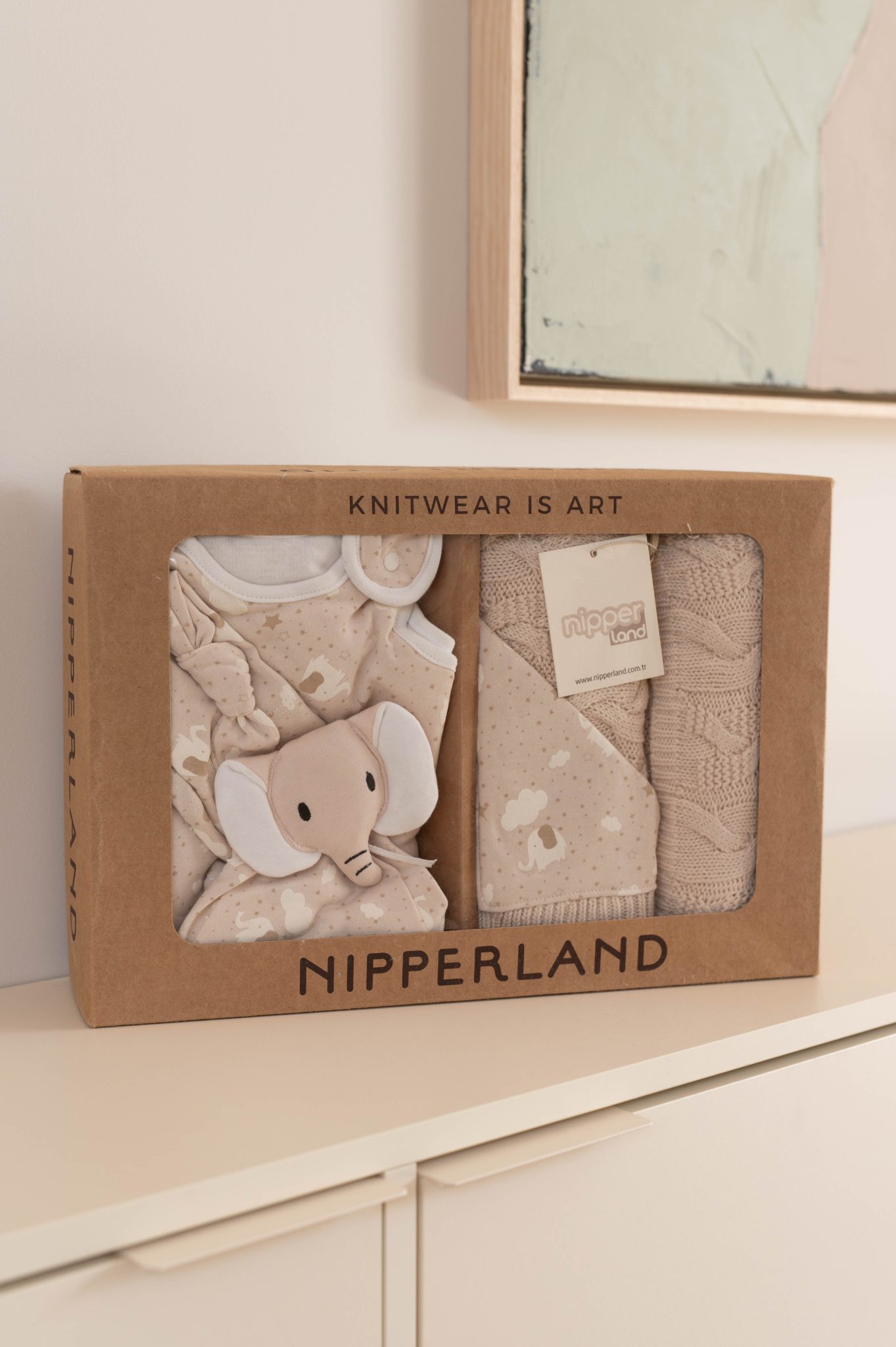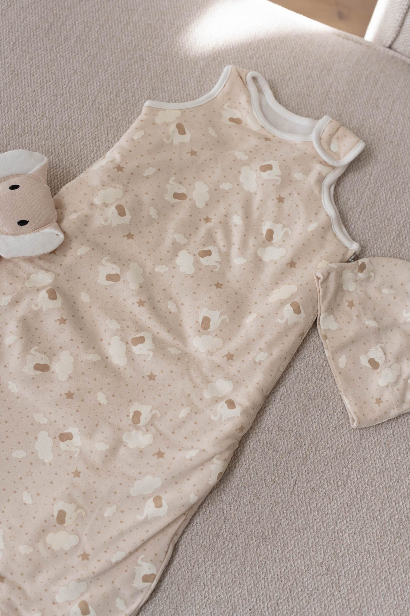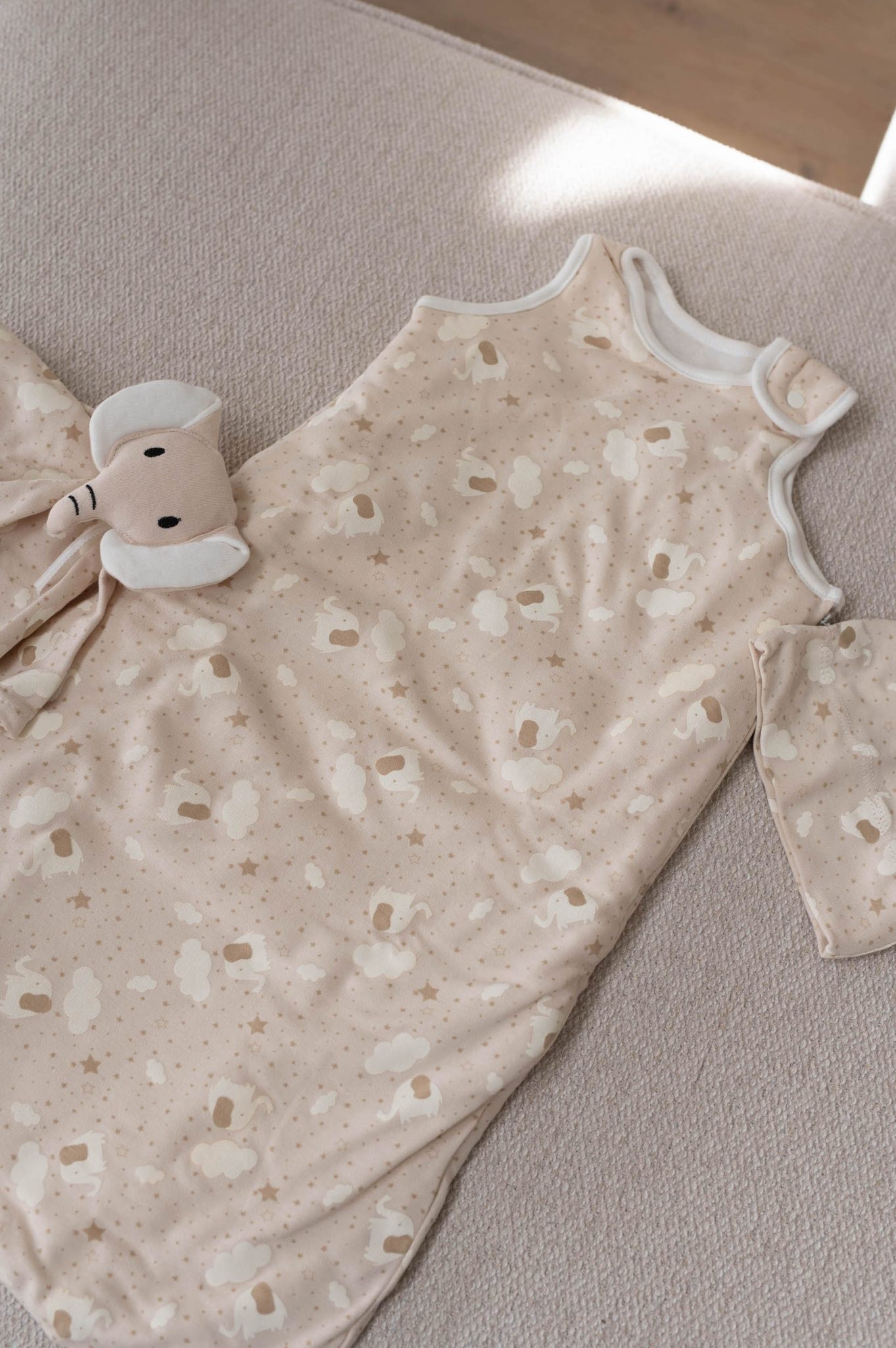 – Couleur taupe et imprimé éléphant, étoiles et nuages