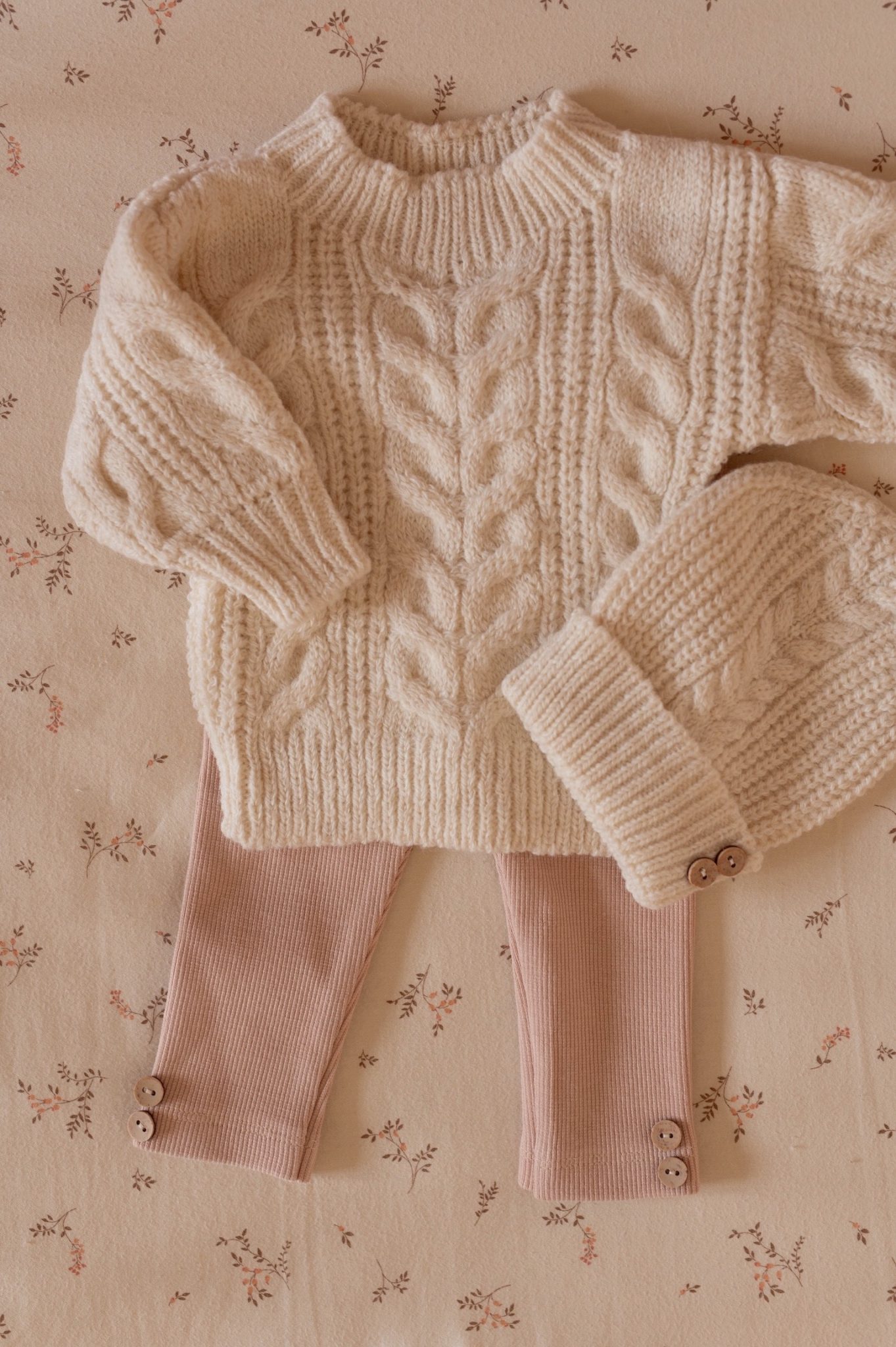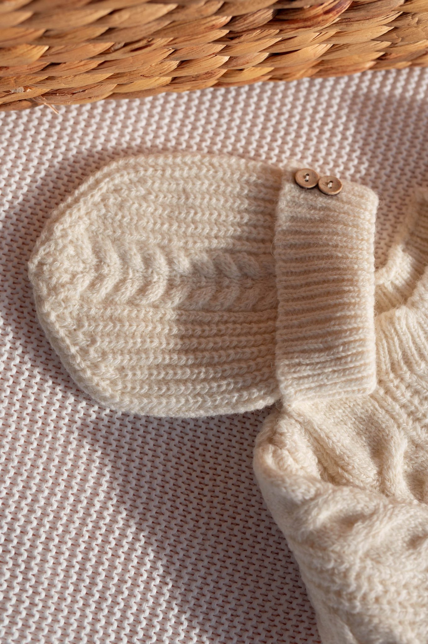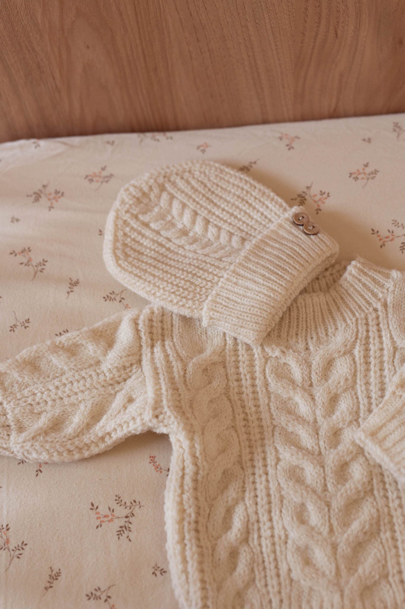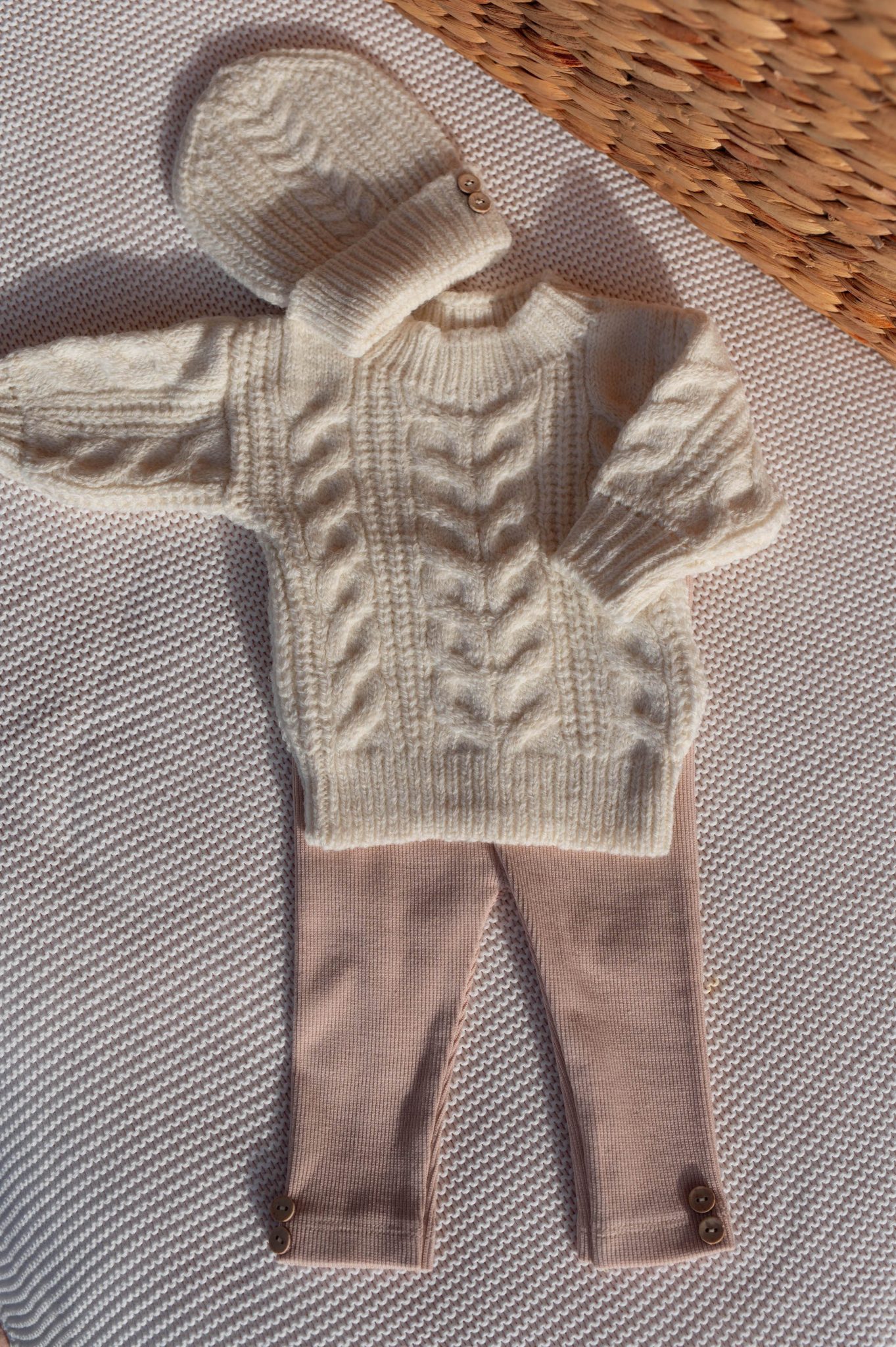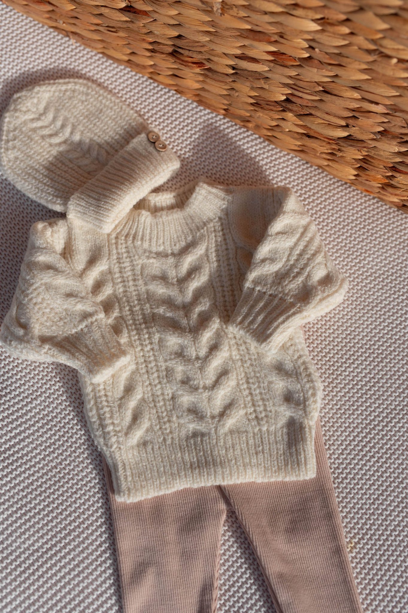 – Pull et bonnet en maille torsadée