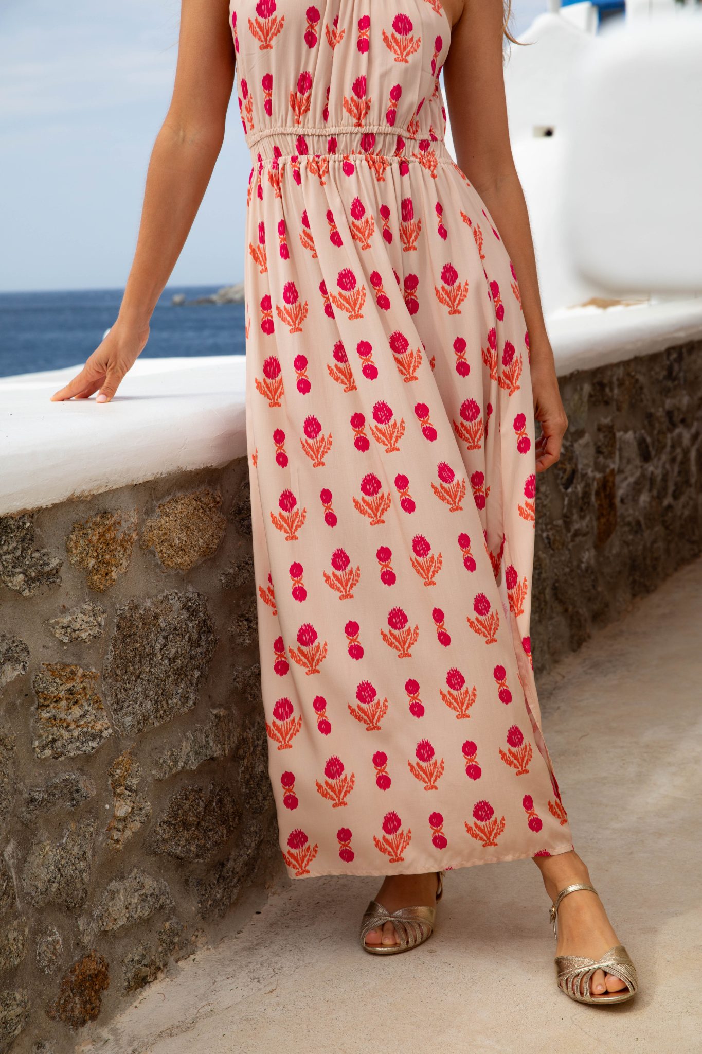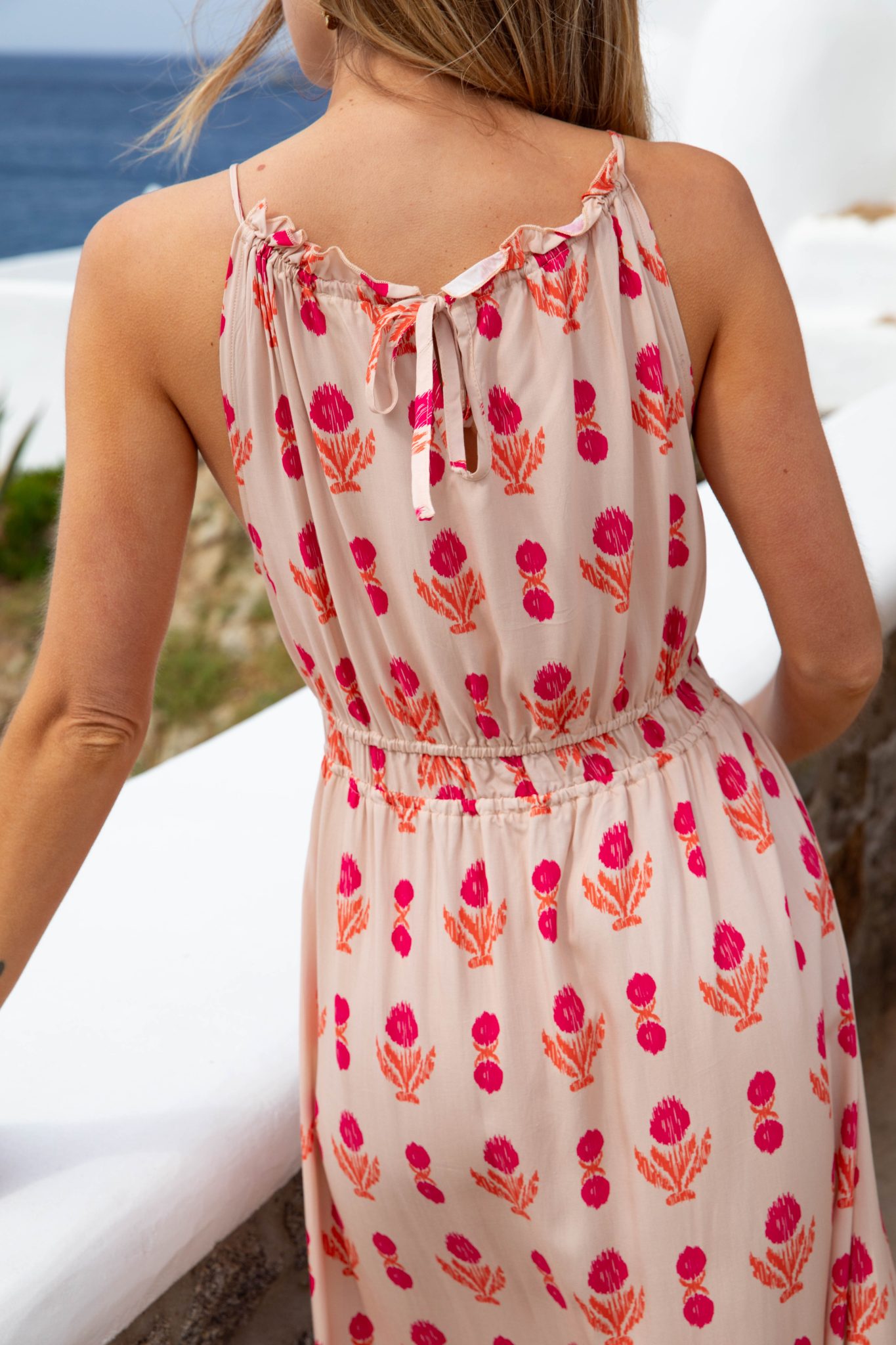 – Couleur : fond pêche, imprimé fuchsia et orange terracotta